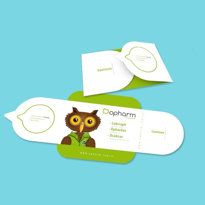 Diseñamos una cartilla plegable con una ilustración de un doctor, facilitando la comprensión del contenido. En el cartel, combinamos una foto del portafolio de productos con una avioneta ilustrada, destacando el respaldo médico de Opharm. Para el empaque, usamos la ilustración de un búho, reforzando el enfoque oftálmico de la marca.